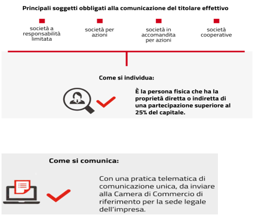 Attenzione al fatto che il mancato adempimento degli obblighi di comunicazione sulla titolarità effettiva comporterà l’applicazione della sanzione, prevista dall’art. 2630 c.c., che va da 103 euro a 1032 euro accertata e contestata dalla Camera di commercio competente.