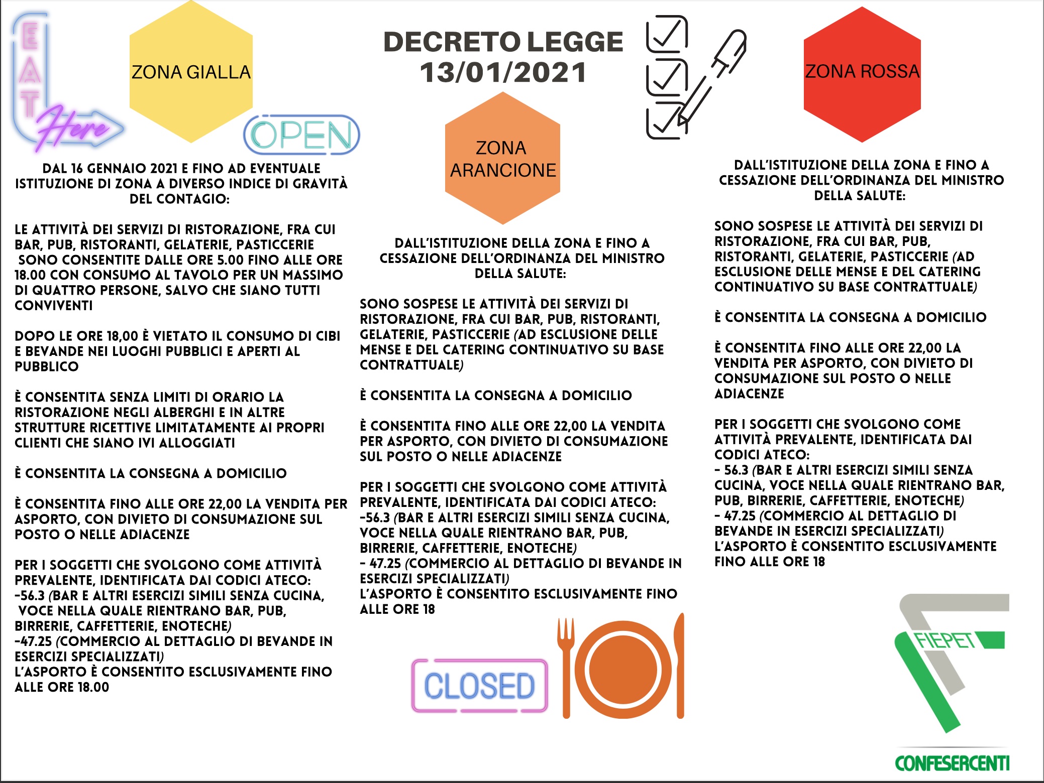Dal 16 gennaio 2021 e fino ad eventuale istituzione di zona a diverso indice di gravità del contagio e fino a cessazione dell’ordinanza del Ministro della Salute, riportiamo un cartello contenente le principali prescrizioni per le attività di somministrazionione e ristorazione.