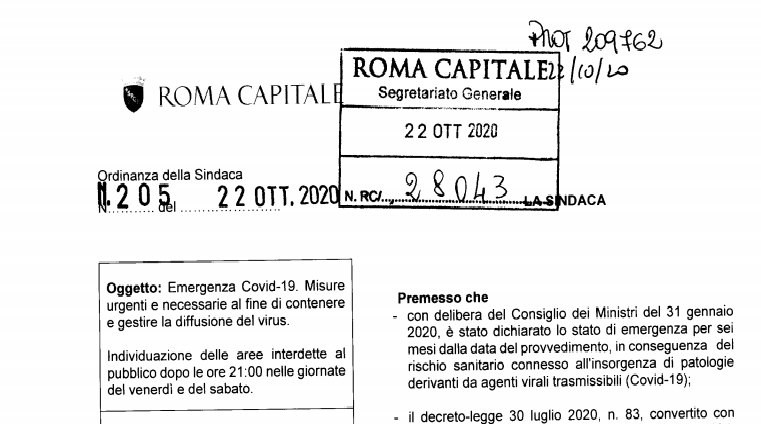 L'Ordinanza resta in esecuzione fino al 13 novembre. Inoltre è in arrivo una nuova Ordinanaza che vieta la vendita di bevande alcoliche. Anticipiamo il testo.