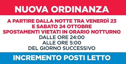La nuova ordinanza della Regione Lazio e Ministero della Salute. L’ordinanza stabilisce, oltre al potenziamento della rete Covid e della didattica digitale, che sul territorio della Regione, dalle ore 24:00 alle ore 5:00 del giorno successivo sono consentiti esclusivamente gli spostamenti motivati da comprovate esigenze lavorative (a titolo esemplificativo il tragitto domicilio, dimora e residenza verso il luogo di lavoro e viceversa), gli spostamenti motivati da situazioni di necessità o d’urgenza, ovvero per motivi di salute. La sussistenza delle situazioni che consentono gli spostamenti in tale arco temporale incombe sull’interessato tenuto ad attestarlo con dichiarazione. Una disposizione che decorre dalle ore 24 di venerdì 23 ottobre...